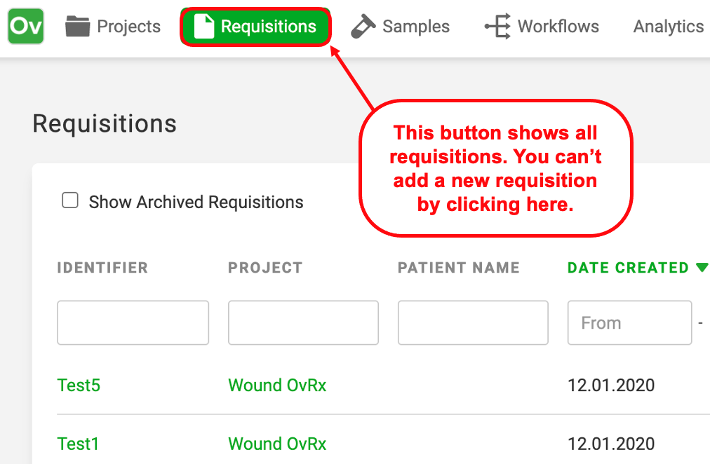 Requisitions are organized under lab Projects. Projects allow users to group their orders based on sample type, test panels, workflows, etc. Each project can have one or more requisition templates.